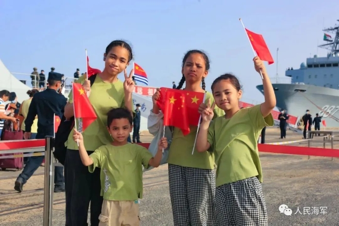 ↑當(dāng)?shù)貢r(shí)間4月26日,海軍軍艦赴蘇丹緊急撤離我在蘇丹人員。圖為兒童高舉國(guó)旗等候登艦。吳亢慈 攝
