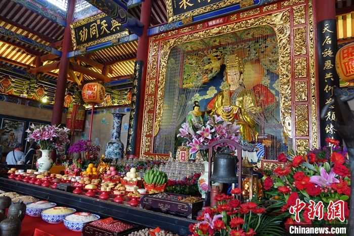 中新網(wǎng)深圳4月28日電 (記者 朱延靜)“祈迎天后圣誕儀典現(xiàn)在開始……”4月27日,深圳南山天后博物館舉行“晨拜媽祖”儀典,來自臺(tái)灣臺(tái)南、高雄的逾百位媽祖信眾參與祭拜。