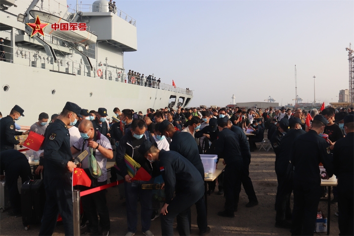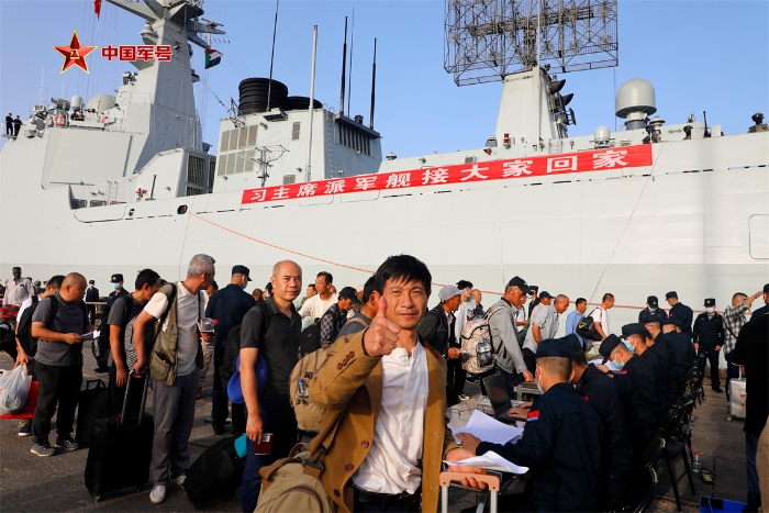 記者從海軍有關(guān)部門了解到,執(zhí)行緊急撤離任務(wù)的海軍軍艦于26日上午提前抵達(dá)并靠泊蘇丹港后,迅速在碼頭設(shè)立安全警戒區(qū)域,特戰(zhàn)隊員持槍擔(dān)負(fù)警戒。在中國駐蘇丹大使館武官、工作人員和海軍官兵引導(dǎo)下,準(zhǔn)備撤離的人員在碼頭進(jìn)行登記和安檢后登艦,撤離過程安全、有序。隨后兩艘軍艦駛離蘇丹港,于當(dāng)?shù)貢r間27日10時許(北京時間27日15時許),先后靠泊沙特吉達(dá)港,完成人員轉(zhuǎn)接后再次迅即奔赴蘇丹港,執(zhí)行后續(xù)接運任務(wù)。