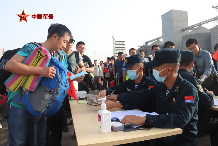 當(dāng)?shù)貢r間4月26日,海軍軍艦赴蘇丹緊急撤離我在蘇丹人員。圖為海軍官兵帶領(lǐng)撤離人員進(jìn)入登記區(qū) 唐思宇