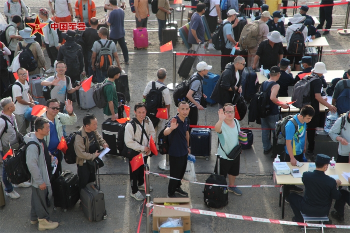 當(dāng)?shù)貢r間4月26日,海軍軍艦赴蘇丹緊急撤離我在蘇丹人員。圖為撤離人員通過安檢激動揮舞國旗 。吳亢慈 攝