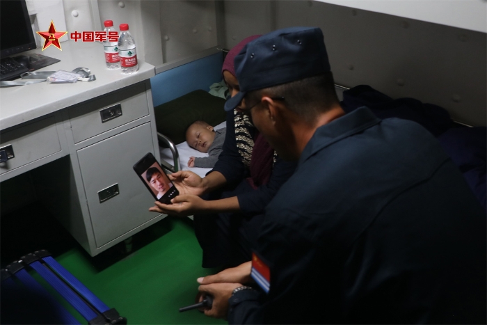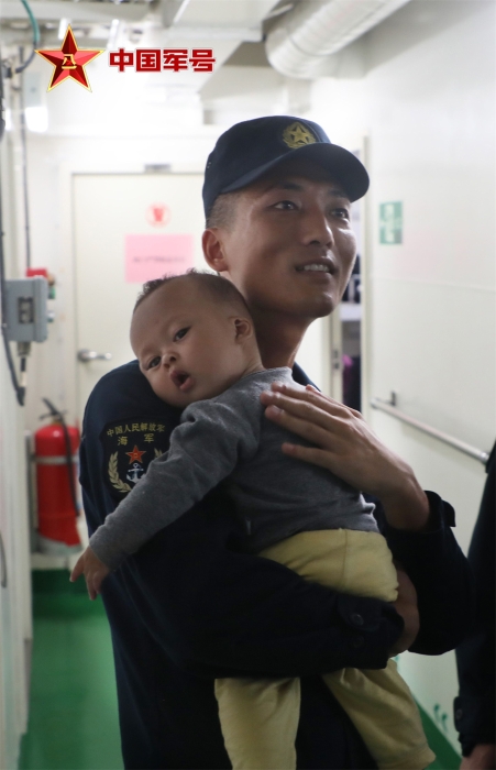 當(dāng)?shù)貢r間4月26日,海軍軍艦赴蘇丹緊急撤離我在蘇丹人員。圖為海軍官兵照顧登艦嬰兒。 劉姝含 攝