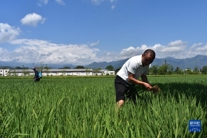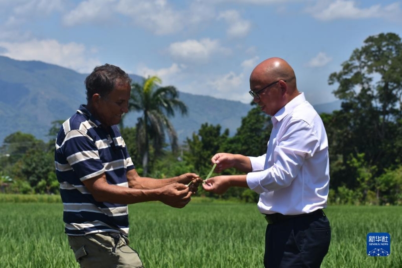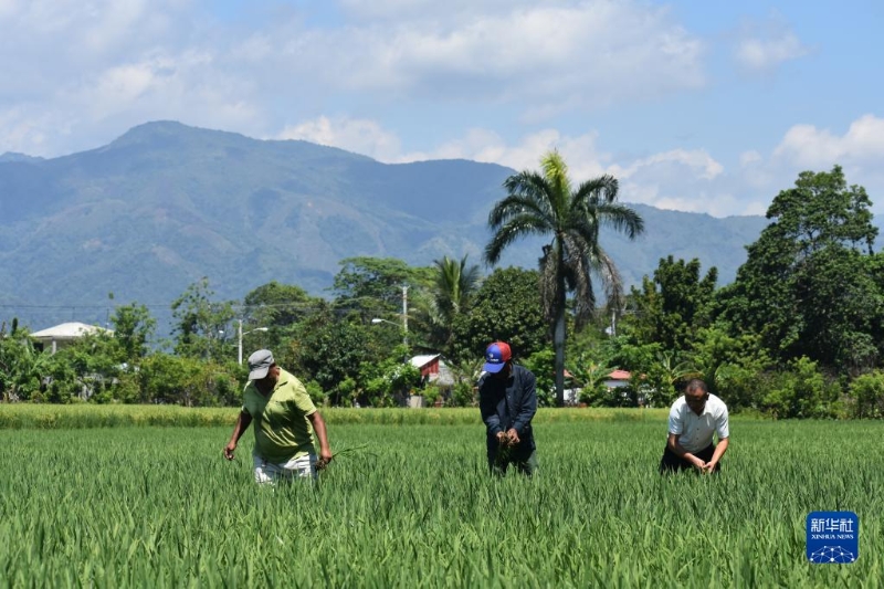 4月26日,在多米尼加首都圣多明各西北約80公里處,中國農(nóng)業(yè)專家(右)和當(dāng)?shù)剞r(nóng)民在多米尼加國家水稻培訓(xùn)中心的一片試驗(yàn)田內(nèi)工作。