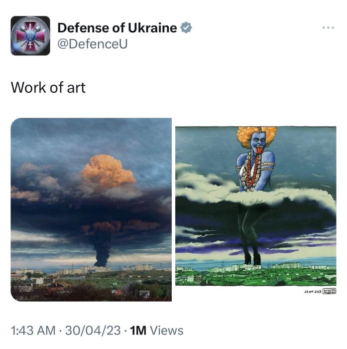 據(jù)俄新社、《印度斯坦時(shí)報(bào)》等多家媒體描述,烏國(guó)防部4月30日發(fā)布的這條推文中包含兩張圖片,第一張描繪了塞瓦斯托波爾灣一油庫(kù)遭無(wú)人機(jī)襲擊后升起的煙柱;另一張則是以第一張為基礎(chǔ)創(chuàng)作的漫畫(huà),爆炸的濃煙中多了一名女性形象,她擺出與瑪麗蓮?夢(mèng)露掩住裙擺相似的姿勢(shì),而這一女性形象本身又與印度教女神卡莉相似。烏克蘭國(guó)防部對(duì)圖片的描述是“藝術(shù)作品(work of art)”。