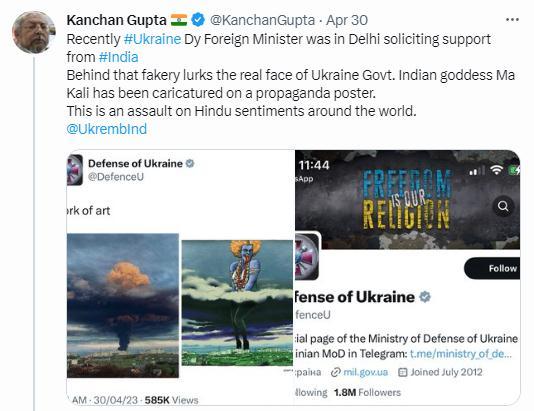 據(jù)俄新社報(bào)道,印度信息和廣播部高級(jí)顧問(wèn)古普塔也對(duì)此表達(dá)了強(qiáng)烈的不滿,他在推特上轉(zhuǎn)發(fā)這一截圖,并寫道,“最近烏克蘭副外長(zhǎng)曾在新德里請(qǐng)求印度支持。這張偽造圖背后隱藏著烏克蘭政府的真實(shí)面目。印度教女神卡莉被諷刺地畫(huà)在一張宣傳海報(bào)上。這是對(duì)全世界印度教徒感情的攻擊”。