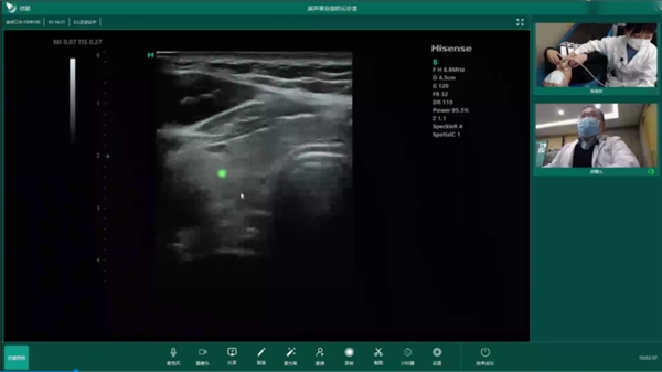在遠程超聲方面,海信醫(yī)療自研信聯(lián)遠程超聲診斷系統(tǒng),采用現(xiàn)代通訊、電子和多媒體計算機技術(shù),實現(xiàn)了超聲遠程實時診斷、遠程教學(xué)、在線質(zhì)控和交流。前不久,在青島,超聲專家與遠在1600多公里之外的定西市通渭縣平襄社區(qū)衛(wèi)生服務(wù)中心進行了遠程超聲會診,基層超聲醫(yī)生使用海信超聲為患者進行超聲檢查,遠端專家在線實時進行操作指導(dǎo)和病例會診,會診大屏同步顯示清晰動態(tài)的超聲圖像。會診過程中,聲音和畫面均做到了同步無延時,遠程超聲讓基層醫(yī)生和遠端專家感受到身臨其境的會診體驗。