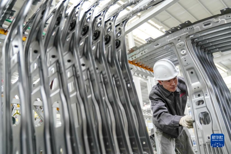 5月4日,在浙江省湖州市長(zhǎng)興經(jīng)濟(jì)技術(shù)開(kāi)發(fā)區(qū)一家汽車(chē)部件有限公司,工人生產(chǎn)新能源汽車(chē)T型梁。