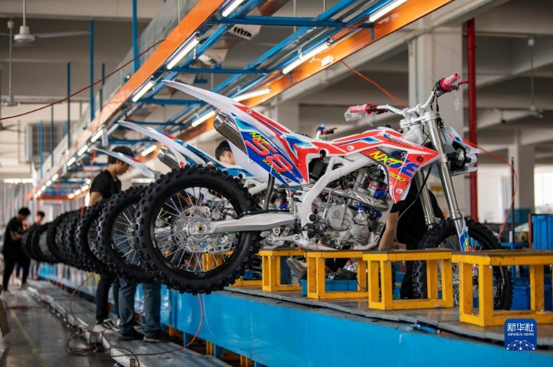 5月4日,在浙江省金華市武義縣桐琴鎮(zhèn)五金工業(yè)區(qū)的一家企業(yè),工人趕制準(zhǔn)備銷(xiāo)往海外的越野摩托車(chē)。