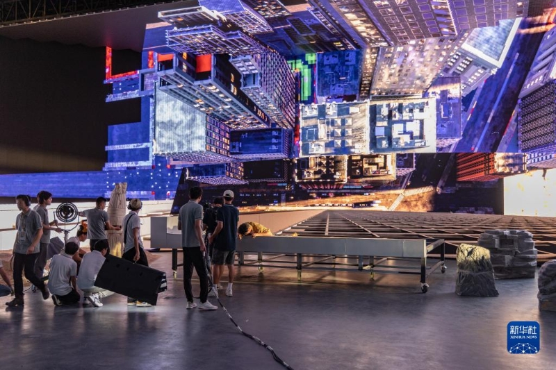 5月5日,在中國影視科技創(chuàng)新成果展上,參展企業(yè)展示LED虛擬拍攝系統(tǒng)。