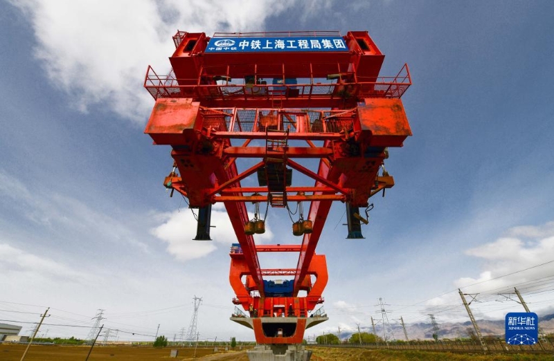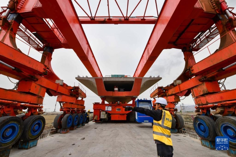 5月5日拍攝的包銀高鐵跨萬(wàn)甘鐵路特大橋箱梁架設(shè)施工現(xiàn)場(chǎng)。