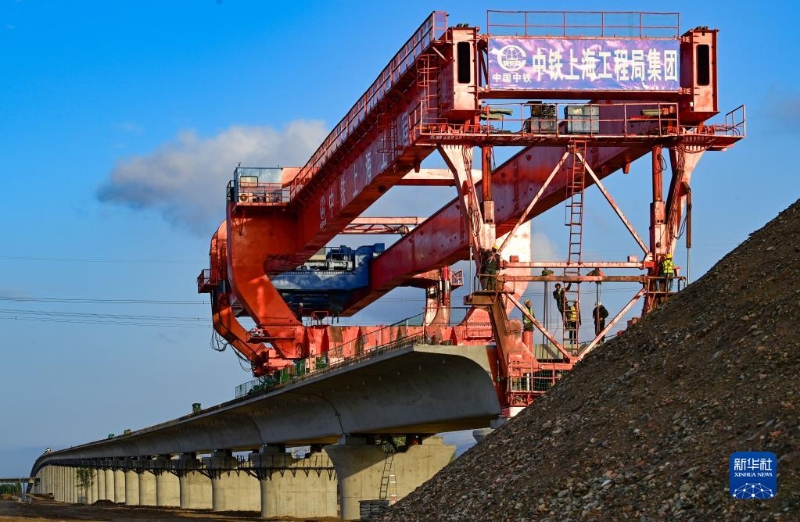 5月5日拍攝的包銀高鐵跨萬(wàn)甘鐵路特大橋箱梁架設(shè)施工現(xiàn)場(chǎng)(無(wú)人機(jī)照片)。