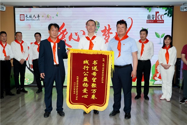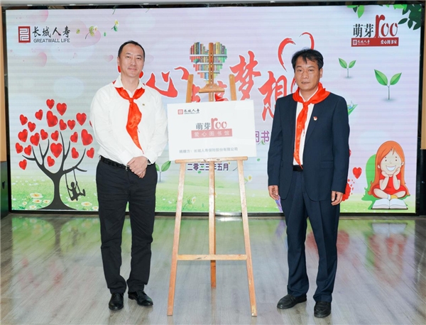 長城人壽黨委書記、董事長白力與祖庵中心學校校長馮軍奇、副校長宋廣柱一同為“萌芽100”愛心圖書室揭牌,進行圖書捐贈,并接受校方回贈的“書送希望聚萬卷 踐行公益揚愛心”錦旗以及學生書畫作品。