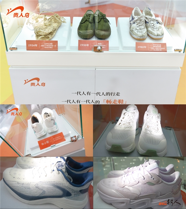 在展覽現(xiàn)場還有個特別的展區(qū),這里展示著不同時代的“經(jīng)典款”——長征時期的草鞋、新中國成立后的解放鞋、改革開放后的旅游鞋……每一雙鞋都是一個時代的縮影,通過一雙具體的鞋子,觀眾能夠重返歷史,感受到當下的幸福的來之不易。