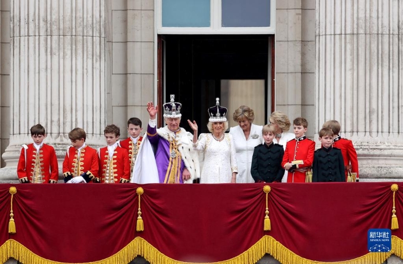 5月6日,在英國倫敦,英國國王查爾斯三世和王后卡米拉加冕后在白金漢宮陽臺向民眾揮手致意。
