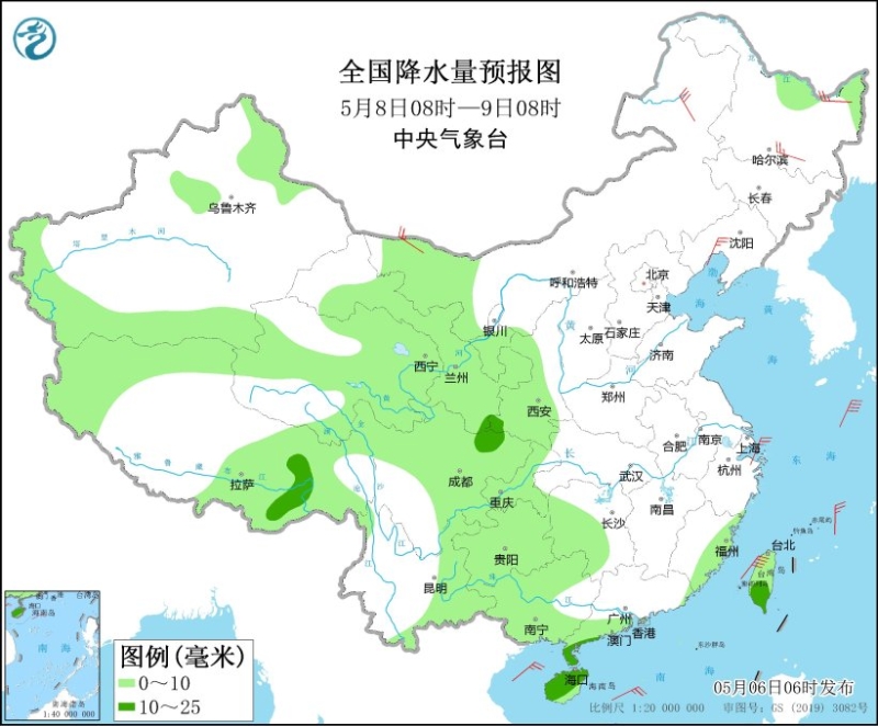 5月8日08時(shí)至9日08時(shí),新疆沿天山地區(qū)和南疆南部、西藏北部和東部、青海東部和南部、甘肅西南部等地部分地區(qū)有小到中雪或雨夾雪;西藏東部、西北地區(qū)東部、內(nèi)蒙古西北部、西南地區(qū)東部、湖南西部、華南南部、臺灣島等地部分地區(qū)有小到中雨。內(nèi)蒙古西部和東北部、黑龍江、遼寧中部等地部分地區(qū)有4~6級風(fēng)。