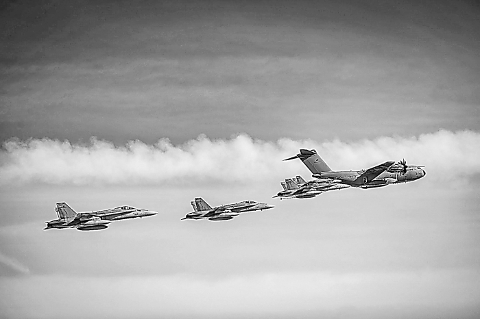 一架德國空軍A400M運輸機與四架芬蘭空軍F/A-18戰(zhàn)機編隊飛行。資料圖片