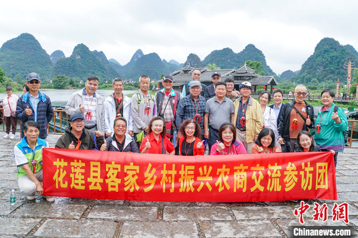 5月7日,臺(tái)灣花蓮縣客家鄉(xiāng)村振興農(nóng)商交流參訪(fǎng)團(tuán)在桂林陽(yáng)朔山水旅游開(kāi)發(fā)有限公司(又稱(chēng)世外桃源景區(qū))合影留念。 中新社發(fā) 蔣豐慧 攝
