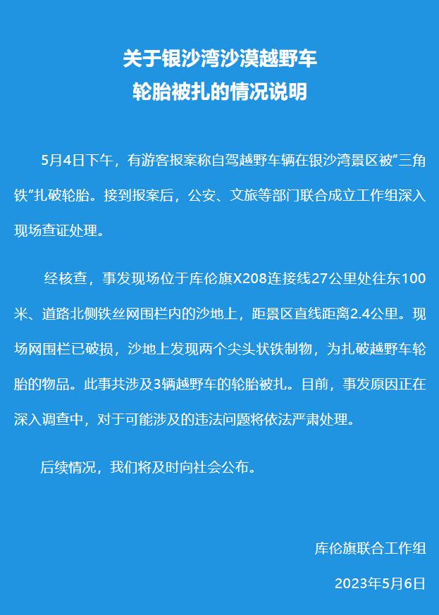 經(jīng)核查,事發(fā)現(xiàn)場位于庫倫旗X208連接線27公里處往東100米、道路北側(cè)鐵絲網(wǎng)圍欄內(nèi)的沙地上,距景區(qū)直線距離2.4公里?,F(xiàn)場網(wǎng)圍欄已破損,沙地上發(fā)現(xiàn)兩個尖頭狀鐵制物,為扎破越野車輪胎的物品。此事共涉及3輛越野車的輪胎被扎。目前,事發(fā)原因正在深入調(diào)查中,對于可能涉及的違法問題將依法嚴肅處理。