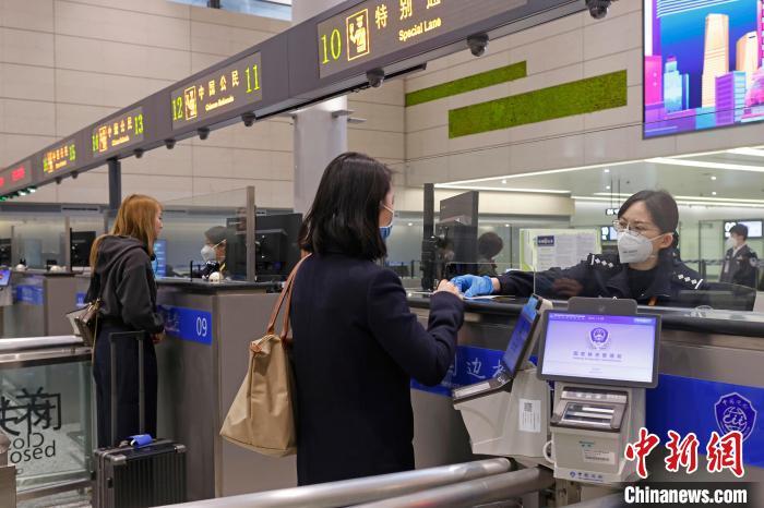 資料圖:虹橋邊檢站民警在對出境旅客進行信息核查?!∫罅⑶?攝