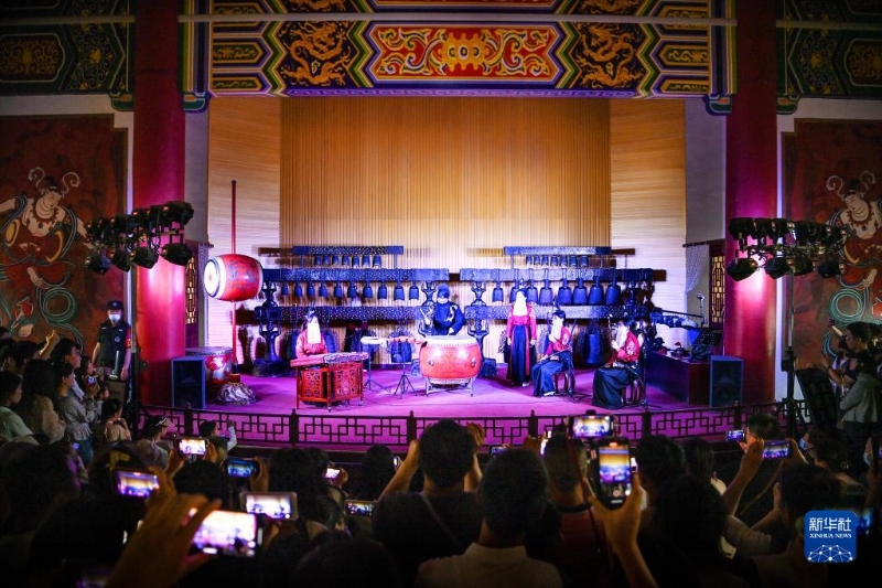 游客在西安鼓樓內(nèi)觀看演出(5月1日攝)。新華社記者 劉瀟 攝