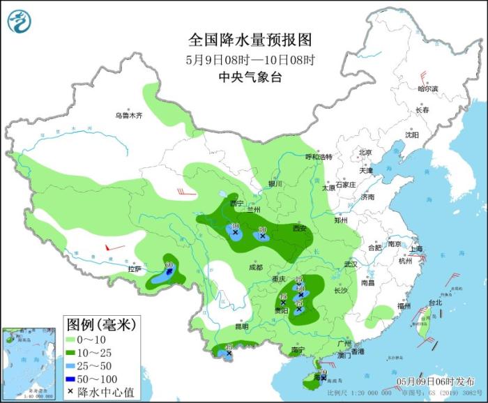5月9日08時(shí)至10日08時(shí),甘肅西南部、青海東部和南部、西藏東部等地的部分地區(qū)有中到大雪或雨夾雪,其中青海東南部等地局地有暴雪;西北地區(qū)東南部、四川北部和東部、重慶、貴州中東部、湖南西部、云南南部、廣西北部和東南部、廣東西南部、海南島及西藏東南部等地的部分地區(qū)有中到大雨,其中,貴州東部、云南南部、海南島局地有暴雨(50~70毫米)。內(nèi)蒙古東北部、黑龍江大部、浙江北部、廣西東南部沿海等地部分地區(qū)有4~6級(jí)風(fēng),其中西藏中部部分地區(qū)有7~8級(jí)風(fēng)。