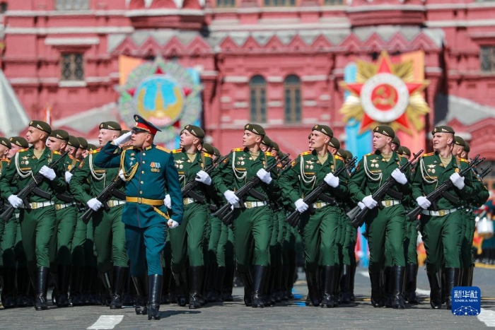 5月9日,在俄羅斯首都莫斯科,士兵列隊走過紅場。新華社記者 曹陽 攝