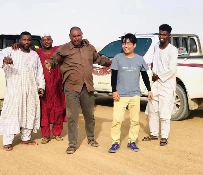 岳遠(yuǎn)志(右二)在蘇丹與當(dāng)?shù)嘏笥押嫌?。受訪者供圖