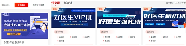 為滿足學(xué)員備考需求,圍繞醫(yī)學(xué)學(xué)習(xí)規(guī)律和學(xué)員學(xué)習(xí)習(xí)慣、學(xué)習(xí)需求,好醫(yī)生醫(yī)考針對不同人群推出了臨床及中醫(yī)精品課程體系,全力保障學(xué)員通關(guān)。第一、試聽網(wǎng)課,好醫(yī)生傾力推出的良心產(chǎn)品,真免費(fèi),每年更新,一直服務(wù)于廣大的醫(yī)考考生;第二、全程精品課,包括全學(xué)科、全階段的臨床執(zhí)業(yè)(助理)好醫(yī)生精講班、好醫(yī)生VIP班、好醫(yī)生強(qiáng)化班以及一戰(zhàn)成醫(yī)精品班,中醫(yī)專業(yè)則有中醫(yī)執(zhí)業(yè)(助理)好醫(yī)生精講班和好醫(yī)生加強(qiáng)班;第三、技能精品課,為滿足學(xué)員技能一次通關(guān),短效提升需求,好醫(yī)生醫(yī)考推出臨床執(zhí)業(yè)(助理)技能提高班、中醫(yī)執(zhí)業(yè)(助理)技能精品班。