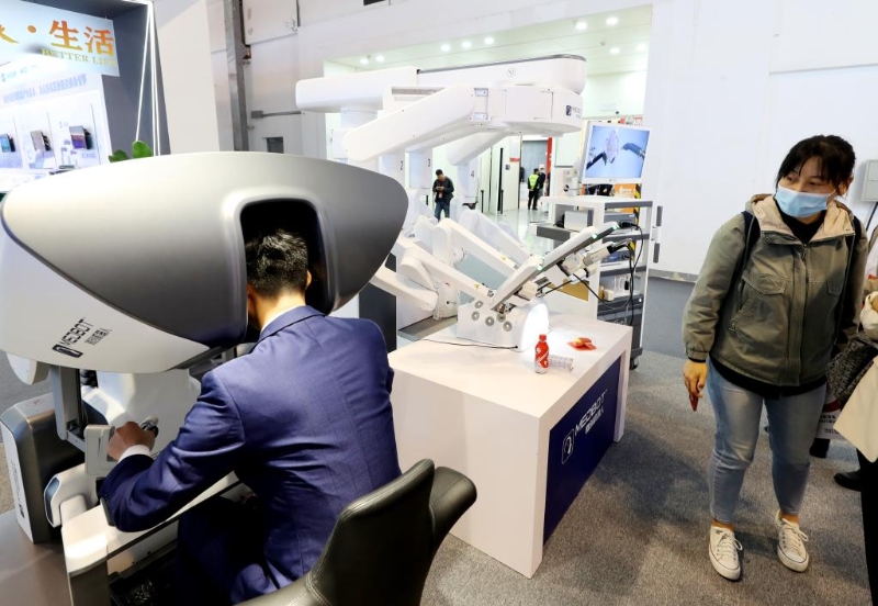 在中國品牌博覽會上海展館,一臺國產(chǎn)四臂腔鏡手術機器人“圖邁”吸引了很多人的關注。這臺機器人由醫(yī)生控制臺、患者手術平臺和圖像平臺三部分組成。醫(yī)生坐在控制臺上,透過三維圖像就可以操控機械臂在患者體內(nèi)移動和進行手術。