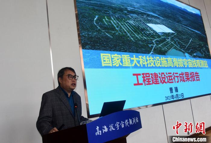 “拉索”首席科學(xué)家、中科院高能所曹臻研究員介紹大科學(xué)裝置工程建設(shè)運(yùn)行成果。 中新社記者 孫自法 攝