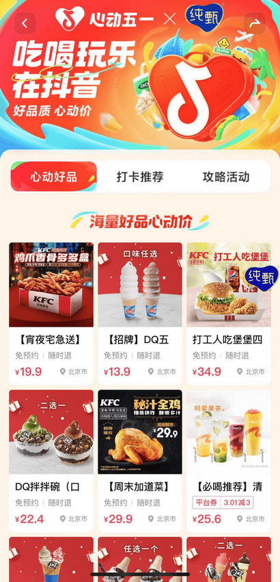 在「心動(dòng)五一」線上主會(huì)場(chǎng)內(nèi),純甄作為本次的獨(dú)家冠名,從話題頁logo露出,到品牌定制專區(qū)內(nèi)容深度植入,再到吸睛懸浮button,不僅以沉浸式覆蓋影響用戶的心智,更通過多個(gè)入口跳轉(zhuǎn)至產(chǎn)品購買頁面,構(gòu)建了完整的轉(zhuǎn)化鏈路。同時(shí),抖音生活服務(wù)整合王牌宣推資源——抖音開屏、專屬阿拉丁、搜索詞展示、同城美食頻道tab展示等,持續(xù)放大品牌曝光,為品牌提供從心智覆蓋-線上種草-線下消費(fèi)-吃喝玩樂心智打通的完整營銷路徑,也為消費(fèi)者帶來更好的體驗(yàn),釋放出更大的消費(fèi)需求。