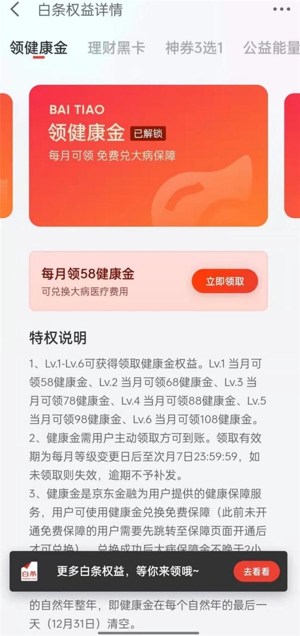 而京東白條權(quán)益體系的全新升級(jí),是京東白條對(duì)廣大用戶的全新回饋方式。升級(jí)后,京東白條權(quán)益共分為L(zhǎng)v.1-Lv.6六個(gè)等級(jí),不同等級(jí)的用戶能享受不同的福利優(yōu)惠和專(zhuān)屬特權(quán),包括微信打白條、打白條返積分、積分還白條、免費(fèi)保障、領(lǐng)健康金、理財(cái)黑卡、神券3選1、公益能量、來(lái)電提醒、忘還無(wú)憂、延期還款等多項(xiàng)權(quán)益,用戶等級(jí)越高,解鎖的權(quán)益越多。