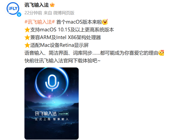 作為國內知名的輸入法品牌之一,此次推出的訊飛輸入法macOS版支持蘋果macOS 10.15及以上更高系統(tǒng)版本,兼容ARM和Intel X86架構處理器,適配了Mac設備Retina顯示屏,其功能應用、兼容性和性能方面均表現(xiàn)良好,將會為蘋果電腦用戶提供更加智能便捷的打字體驗。