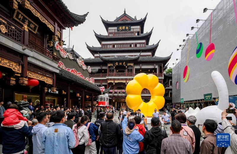 5月7日,市民游客在上海豫園商城中心廣場(chǎng)觀看街頭藝術(shù)表演。新華社記者 劉穎 攝