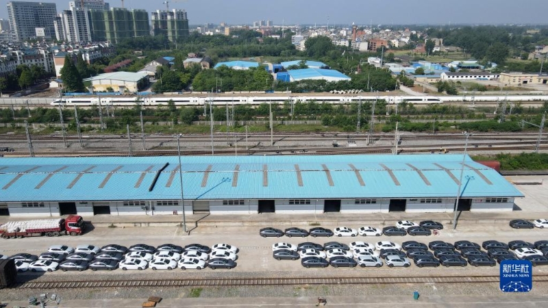 這是位于合肥市長(zhǎng)豐縣的鐵路水家湖貨運(yùn)站等待裝車(chē)外運(yùn)的新能源汽車(chē)(5月9日,無(wú)人機(jī)照片)。新華社記者 劉軍喜 攝