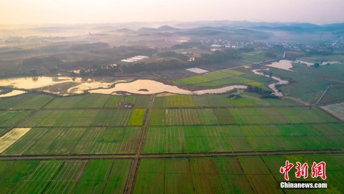 資料圖:2月16日,清晨時(shí)分的江西省新余市渝水區(qū)羅坊鎮(zhèn)東邊村高標(biāo)準(zhǔn)農(nóng)田生機(jī)盎然,冬天分批種下的油菜黃綠相間傳遞著春天的氣息。趙春亮 攝