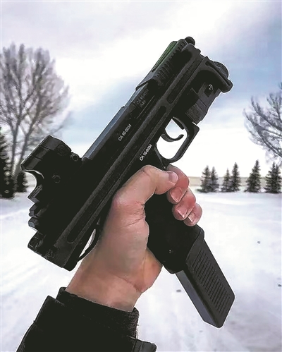 瑞士B&T公司推出的USW手槍也帶有槍托。不過,它的槍托并非臨時駁接,而是套件化后“長”在手槍身上。平時,槍托向前折疊,緊貼在手槍槍體右側(cè);需要時,就可向后打開,發(fā)揮槍托應有的作用。