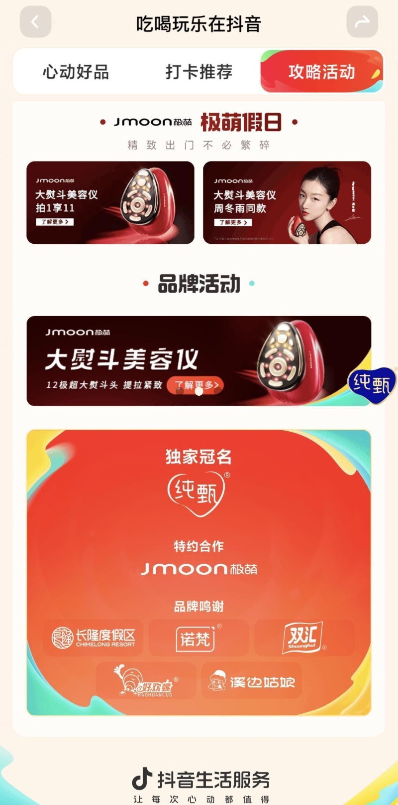 「心動五一」是抖音生活服務基于對用戶吃喝玩樂需求的洞察衍生出的重要營銷IP,滋生于五一長假這一2023年首個消費高峰,主打線上+線下大事件,線上匯聚吃喝玩樂商家大促,線下組織以生活嘉年華為主的活動。在當前客群基礎上,Jmoon極萌期望獲得進一步拓展,便以特約合作伙伴的身份參與了抖音生活服務定制的「心動五一」,借助夏季節(jié)點,短時間內聚起了最大化流量,產(chǎn)生熱點話題集中注意力,帶動了大眾的情感消費,沉淀了品牌新用戶資產(chǎn)。