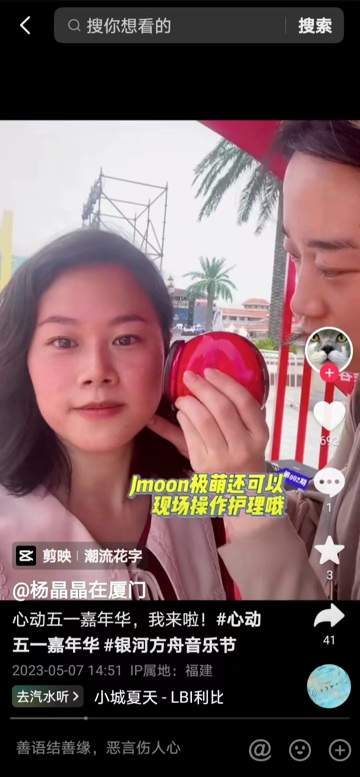 本地生活達人如@廈門大美麗、@楊晶晶在廈門 等眾多抖音達人,用直播或拍短視頻的形式,介紹現(xiàn)場實況的同時,也會插入講解Jmoon極萌的新品,“相比傳統(tǒng)產(chǎn)品4個電極片,Jmoon極萌有12個“一機多用”,帶無法到達現(xiàn)場的用戶沉浸式感受。
