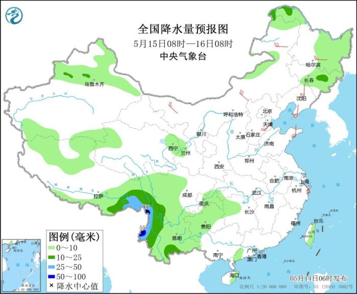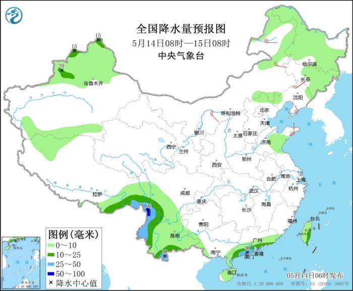 5月14日08時(shí)至15日08時(shí),東北地區(qū)北部和東部、山東東部、華南沿海、云南大部、西藏東部、新疆北部等地部分地區(qū)有小到中雨,其中,廣東西南部沿海、云南西部和南部、西藏東南部等地部分地區(qū)有大雨(25~40毫米),云南西北部局地暴雨(50~60毫米)。新疆北部、內(nèi)蒙古、東北地區(qū)南部等地部分地區(qū)有4~6級(jí)風(fēng)。