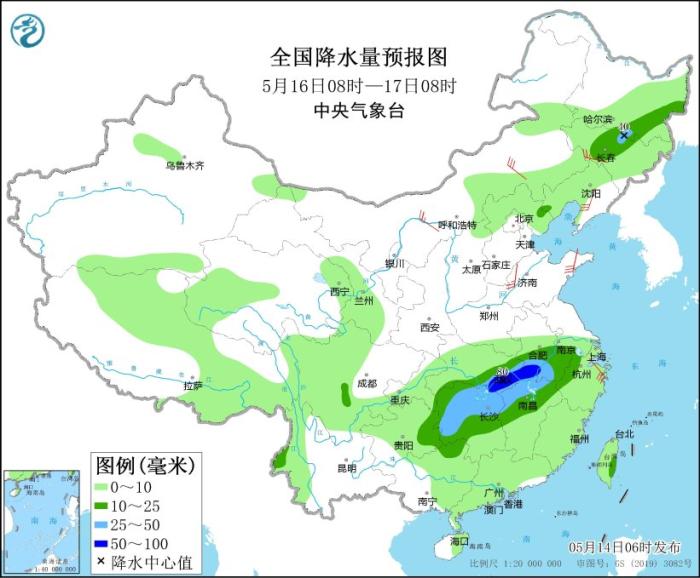 5月16日08時(shí)至17日08時(shí),黑龍江東南部、吉林中部、安徽中南部、浙江西部、湖北東南部、江西北部、湖南中北部、四川盆地西南部、云南西部、臺(tái)灣島東部等地部分地區(qū)有中到大雨,其中,安徽西南部、湖北東部等地部分地區(qū)有暴雨(50~80毫米)。新疆東部、內(nèi)蒙古、東北地區(qū)中南部、華北北部和東部、黃淮中東部、浙江東部等地部分地區(qū)有4~6級(jí)風(fēng)。