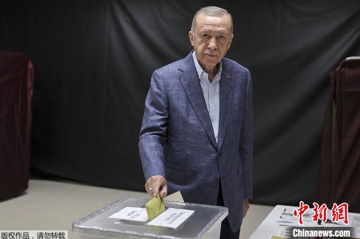 當(dāng)?shù)貢r間5月14日,土耳其總統(tǒng)和議會選舉投票開始,圖為埃爾多安在投票站投票。
