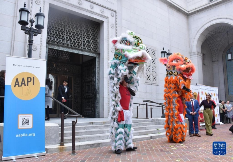5月12日,在美國(guó)洛杉磯市政廳,一對(duì)舞獅在亞太裔傳統(tǒng)月慶?;顒?dòng)上表演。新華社發(fā)(曾慧攝)