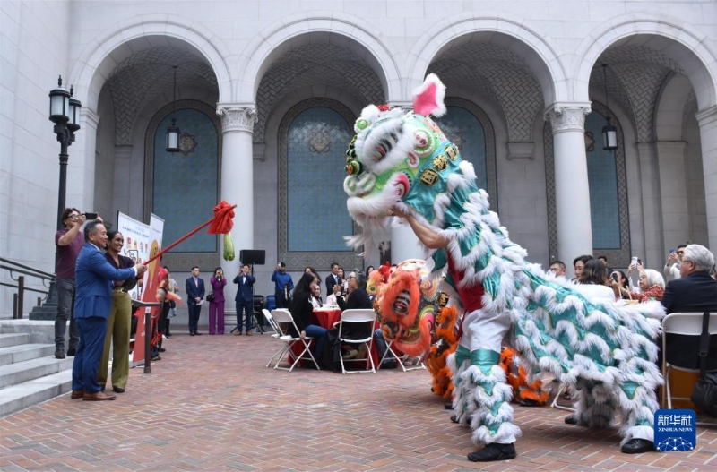 12日,在美國(guó)西海岸第一大城市洛杉磯,兩只色彩鮮艷的中國(guó)舞獅在歡樂的鑼鼓聲中,從市政廳高大的主門躍出,翻騰跳躍,精彩的表演贏得門前上百名當(dāng)?shù)貋喴嵘鐓^(qū)各族裔代表的陣陣喝彩。