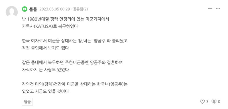 在韓聯(lián)社網(wǎng)站相關(guān)報道的評論區(qū)內(nèi),一名自稱上世紀(jì)80年代在駐韓美軍附編韓軍服役過的網(wǎng)友留言道:“我曾在美軍基地俱樂部中親眼見過這些所謂的‘洋公主’,也就是為美軍服務(wù)的韓國性工作者?!?/p>