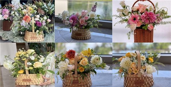 活動現(xiàn)場,花藝插花課老師詳細地為女職工介紹了鮮花品種和寓意,耐心講解插花的花材選擇、色彩搭配、擺放技巧等花藝知識。帶領大家認識了手中的花材,其中有溫馨的康乃馨、恬靜的芍藥、熱烈的玫瑰,還有一些搭配使用的滿天星。隨后,老師向大家現(xiàn)場演繹與指導如何藝術插花,大家一邊看,一邊拿著自己眼前的花材進行對比,琢磨著如何下手。經(jīng)過一個多小時的創(chuàng)作,一籃籃燦爛繽紛、新穎別致的插花作品“新鮮出爐”?;ㄋ嚴蠋煂Σ寤ㄗ髌愤M行一一點評指導。