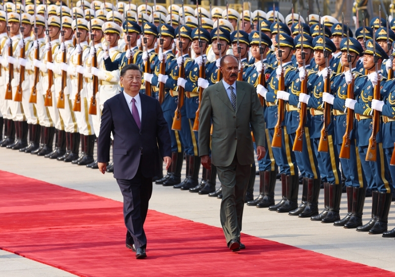 伊薩亞斯抵達(dá)時(shí),禮兵列隊(duì)致敬。兩國元首登上檢閱臺(tái),軍樂團(tuán)奏中厄兩國國歌,天安門廣場鳴放21響禮炮。伊薩亞斯在習(xí)近平陪同下檢閱中國人民解放軍儀仗隊(duì),并觀看分列式。