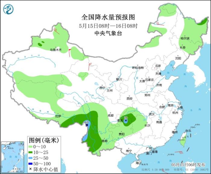 5月15日08時至16日08時,黑龍江東北部、西藏東部、川西高原南部、重慶中部、云南西部等地部分地區(qū)有中到大雨,其中,云南西北部等地部分地區(qū)有暴雨(50~60毫米)。內(nèi)蒙古東北部、甘肅河西、新疆東部等地部分地區(qū)有4~6級風(fēng)。