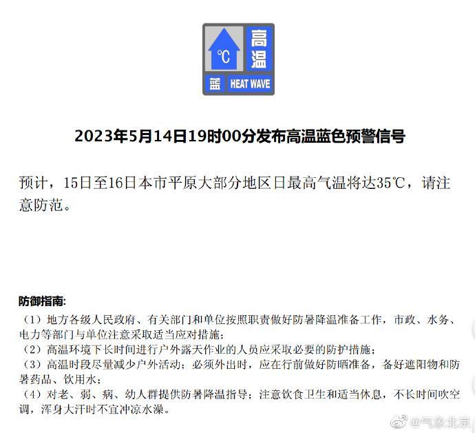 北京市氣象臺(tái)首席預(yù)報(bào)員趙瑋表示,受暖氣團(tuán)影響,預(yù)計(jì)15日至16日,北京市將出現(xiàn)高溫天氣。天氣以晴到多云為主,平原大部分地區(qū)最高氣溫在35℃左右,體感炎熱。北京市氣象臺(tái)已于14日19時(shí)發(fā)布高溫藍(lán)色預(yù)警信號(hào)。17日最高氣溫將回落至28℃左右。