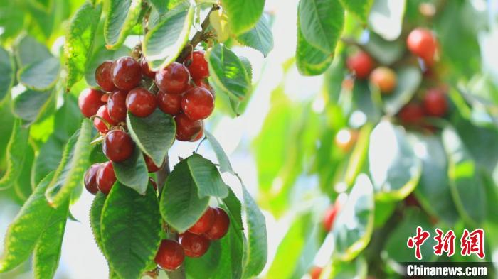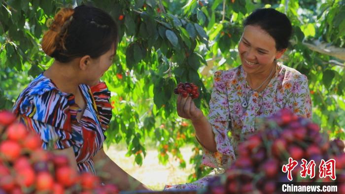 中新網(wǎng)記者走進(jìn)莎車縣米夏鎮(zhèn)夏瑪勒巴格“米夏紅”櫻桃精品園里,翠綠的枝頭上掛滿了鮮紅的果實(shí),果農(nóng)們正忙著采摘。